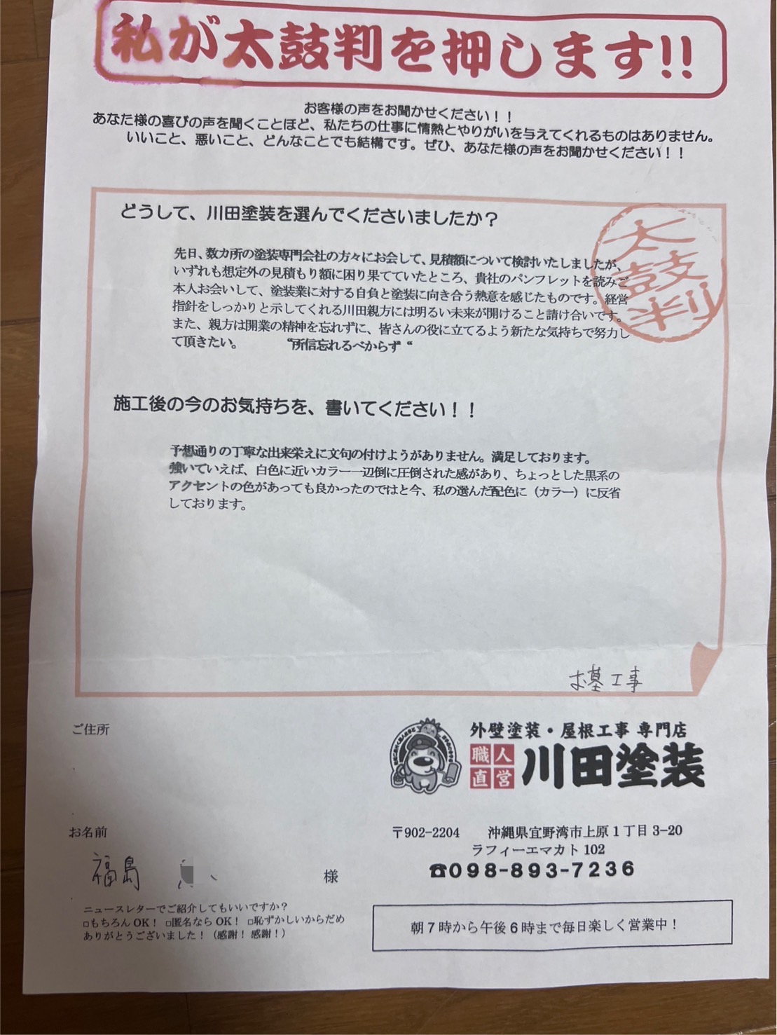 「大変お世話になっております。福島様、この度は弊社に工事のご依頼誠にありがとうございました。お墓の塗装工事ということもあり、配色が難しく思われたと思います。またご自宅の塗装の際はよろしくお願いいたします。