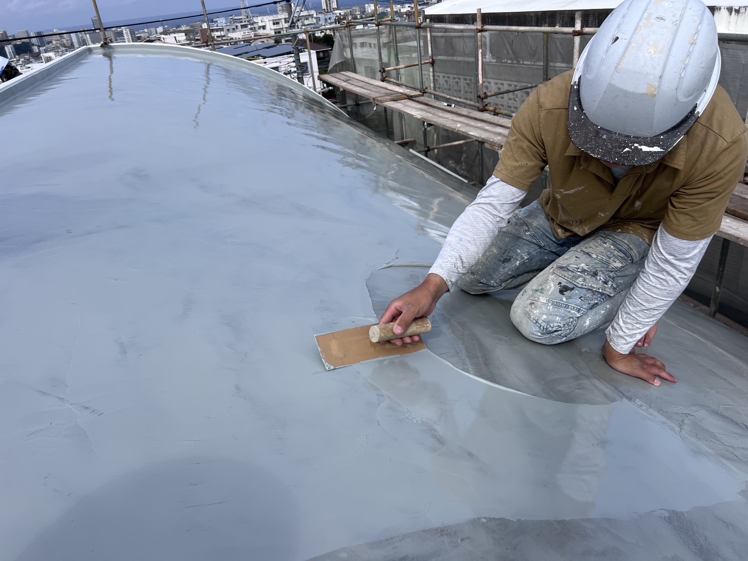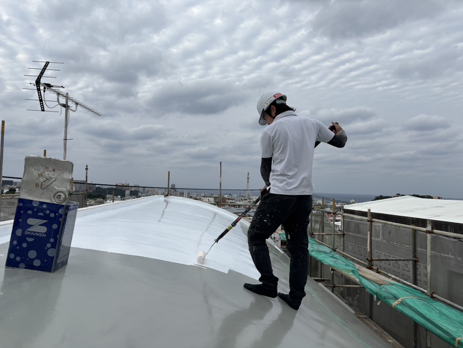 今日は嘉数の現場の屋上R屋根の防水工事・遮熱塗装を行いました。写真に写っているのは、富村親方です。心を込めた丁寧な施工が評判の親方です。