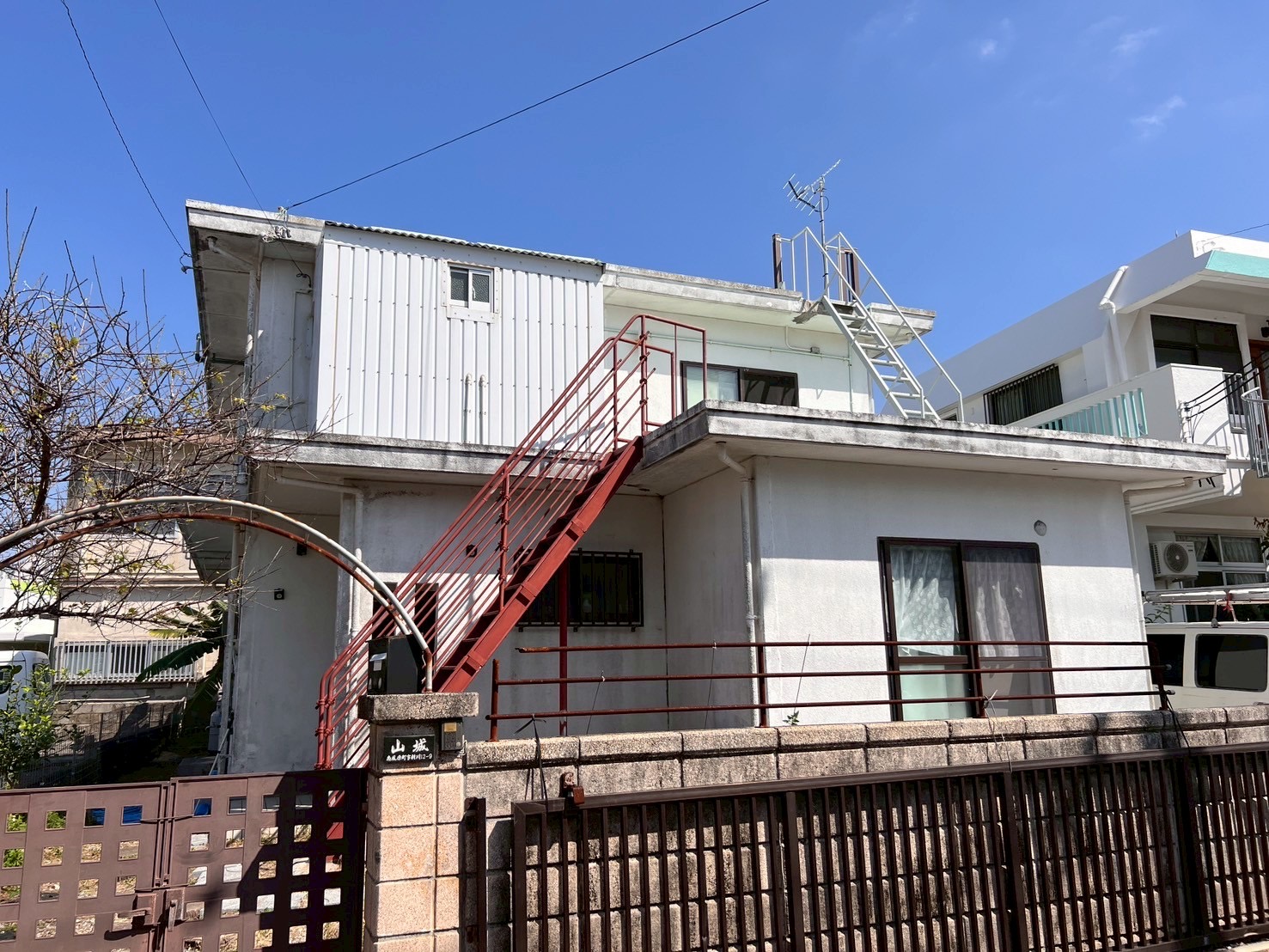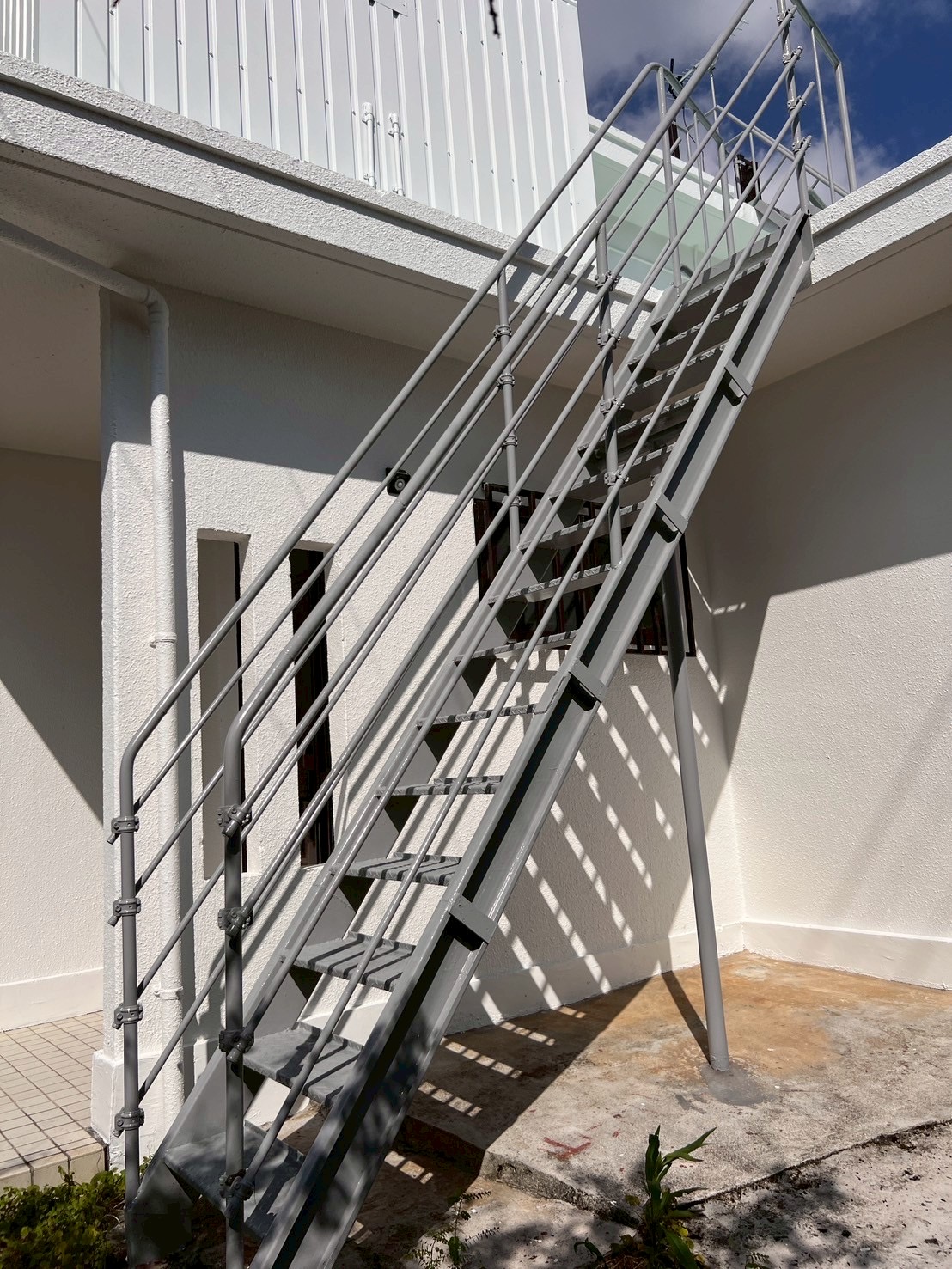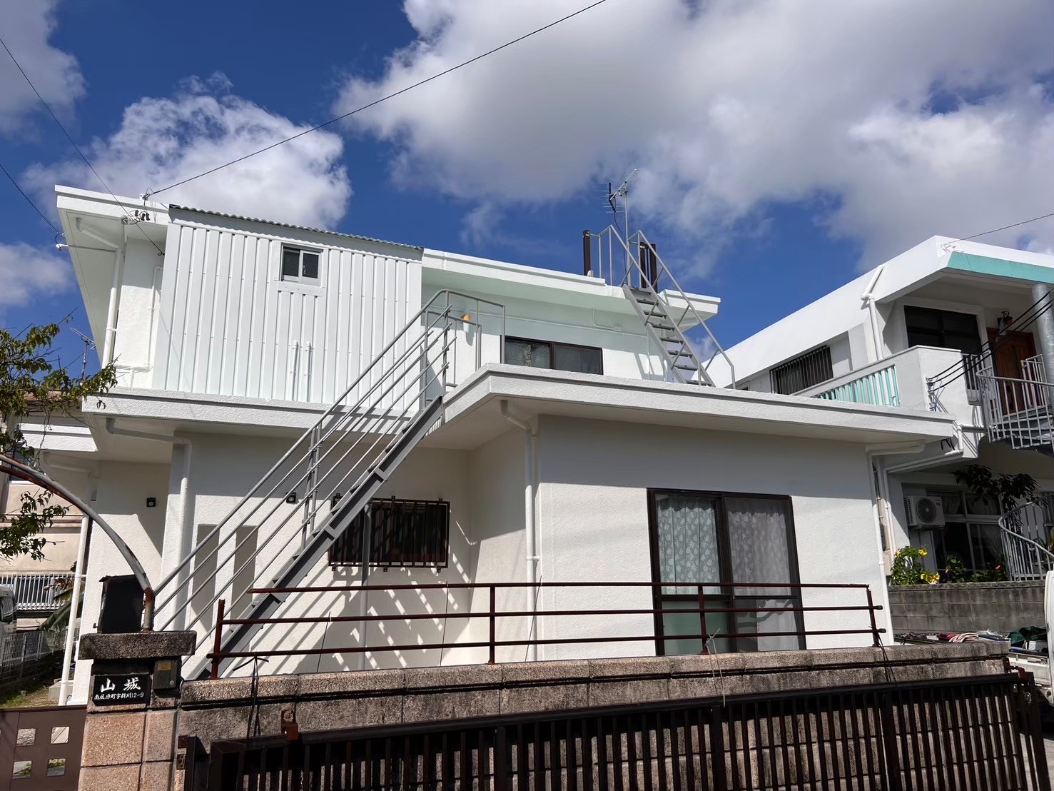 | デザイン塗装 | 外壁:1色 ホワイト 鉄骨階段:グレー 防水トップコート:ライトグリーン |