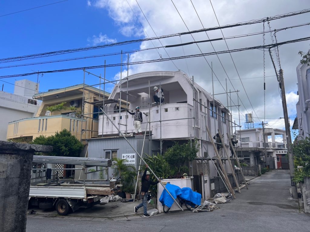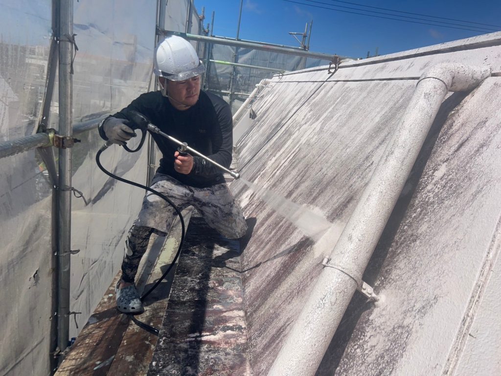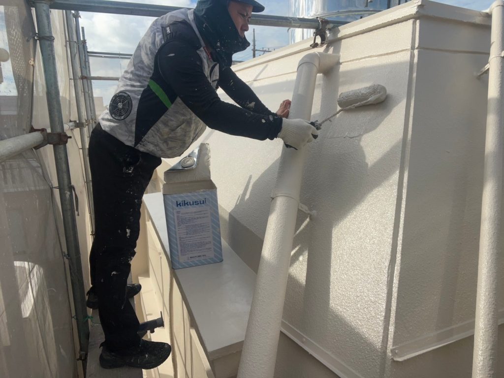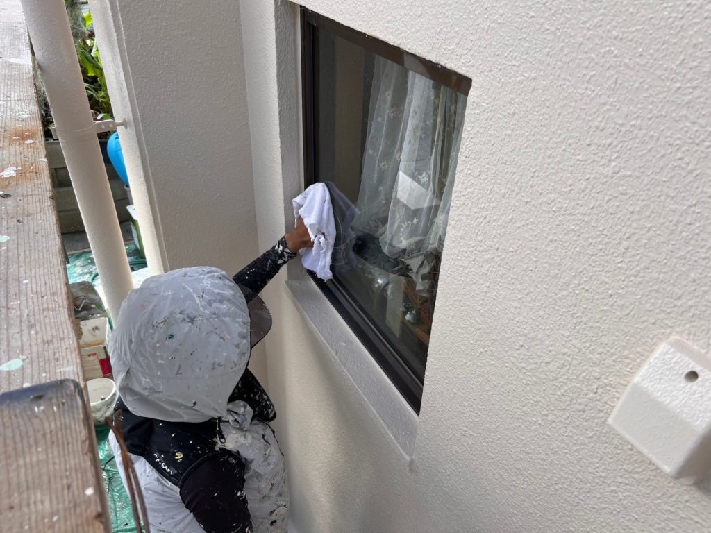 窓ガラスや塗らない所をしっかりとビニール養生していきます!