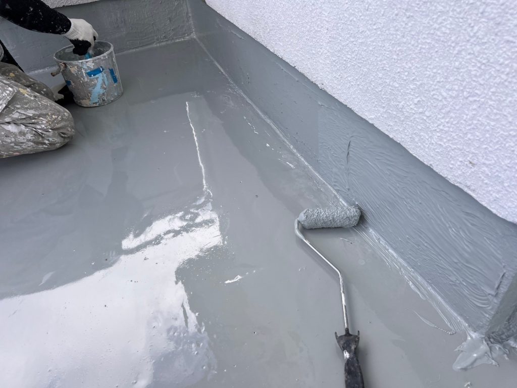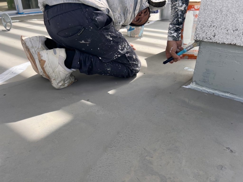 立ち上がりの上の入隅部分までしっかり防水材を塗っていきます