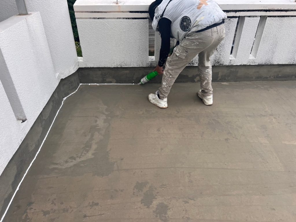 下塗りを終えた後に入隅に先にシーリング材を打つことで防水層の入隅の亀裂を防ぐことができます