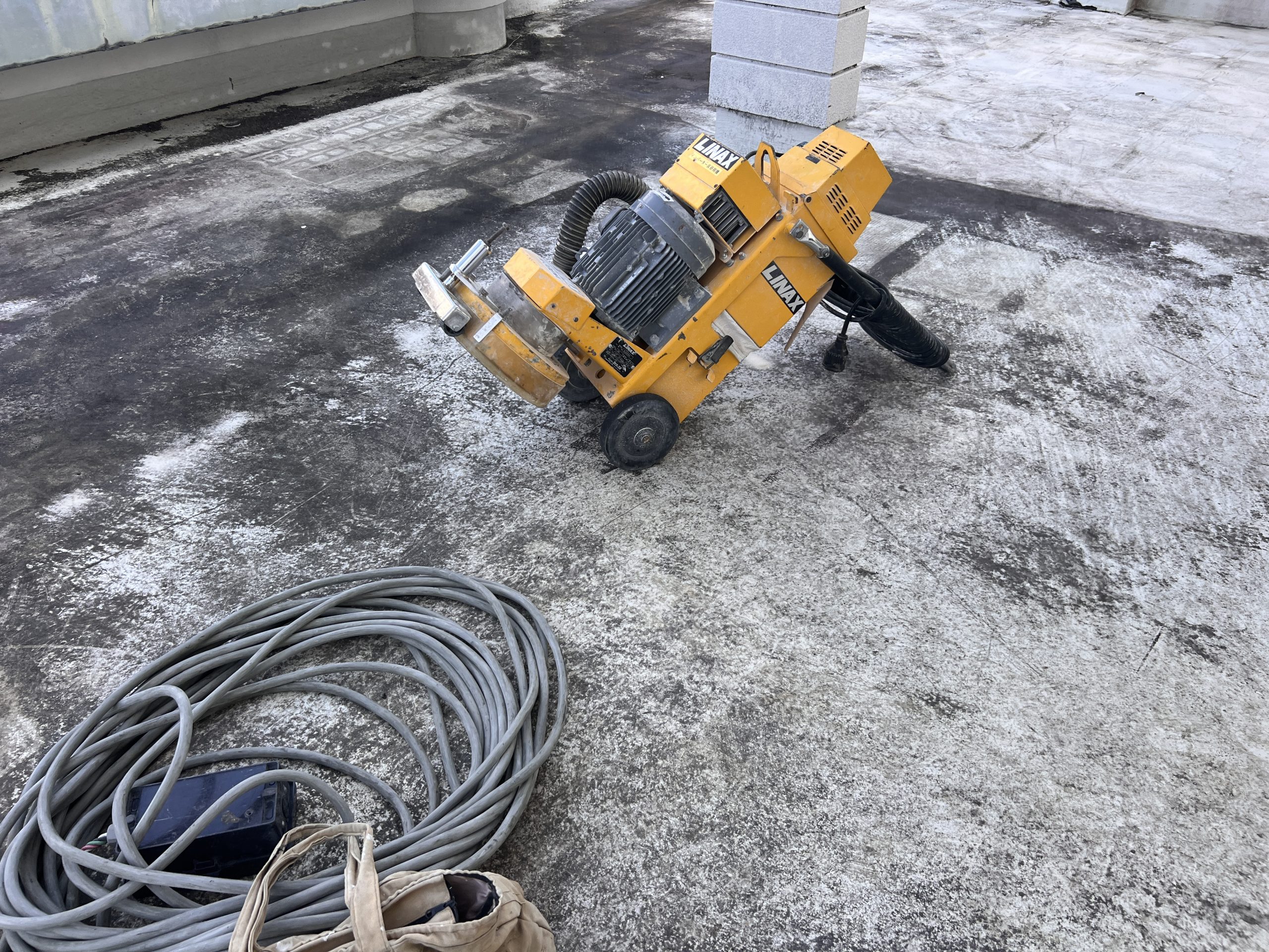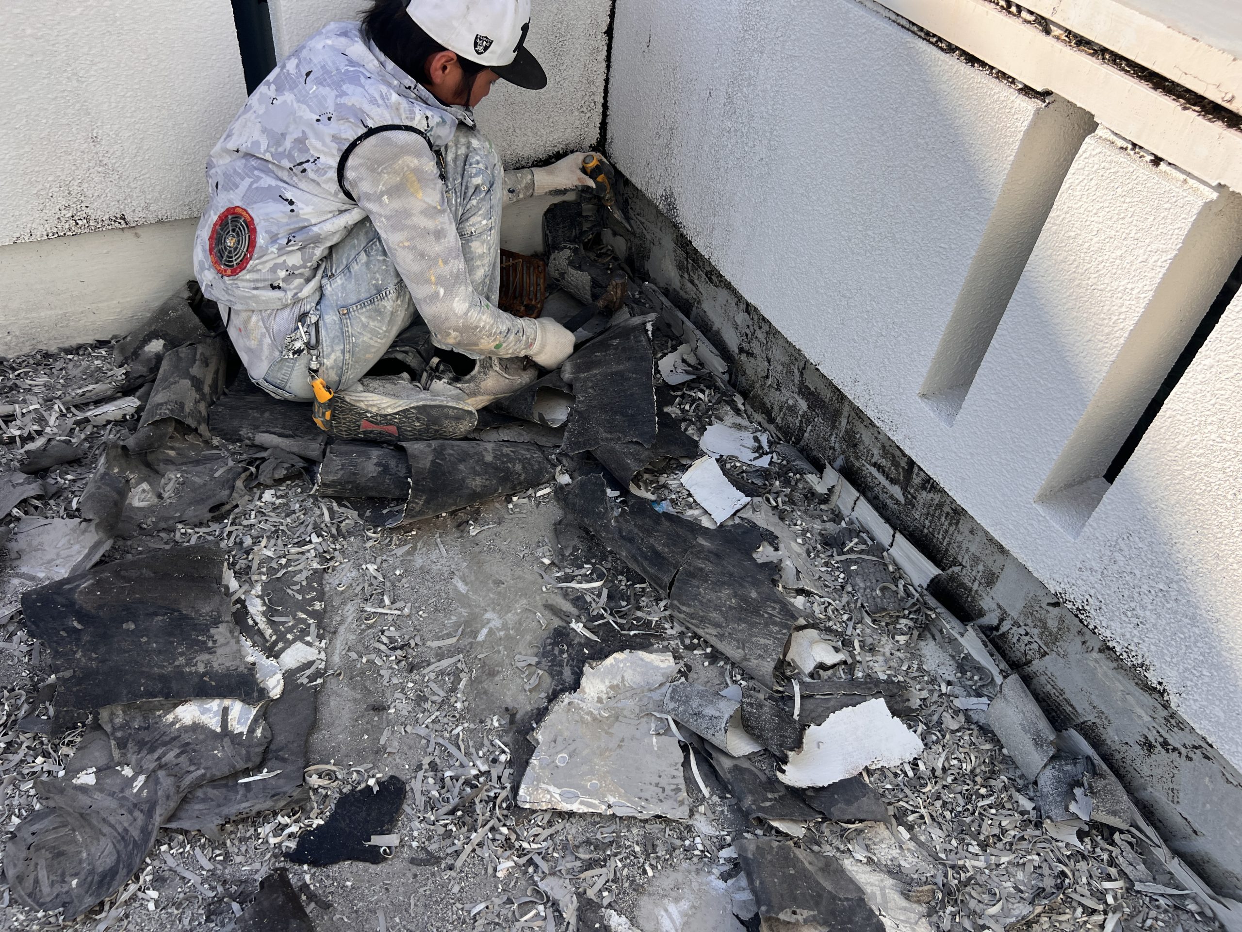 今日からまた新しく始まる現場です。防水工事を、行うのですが、まずは既存の防水層を剥ぎ取っていきます!