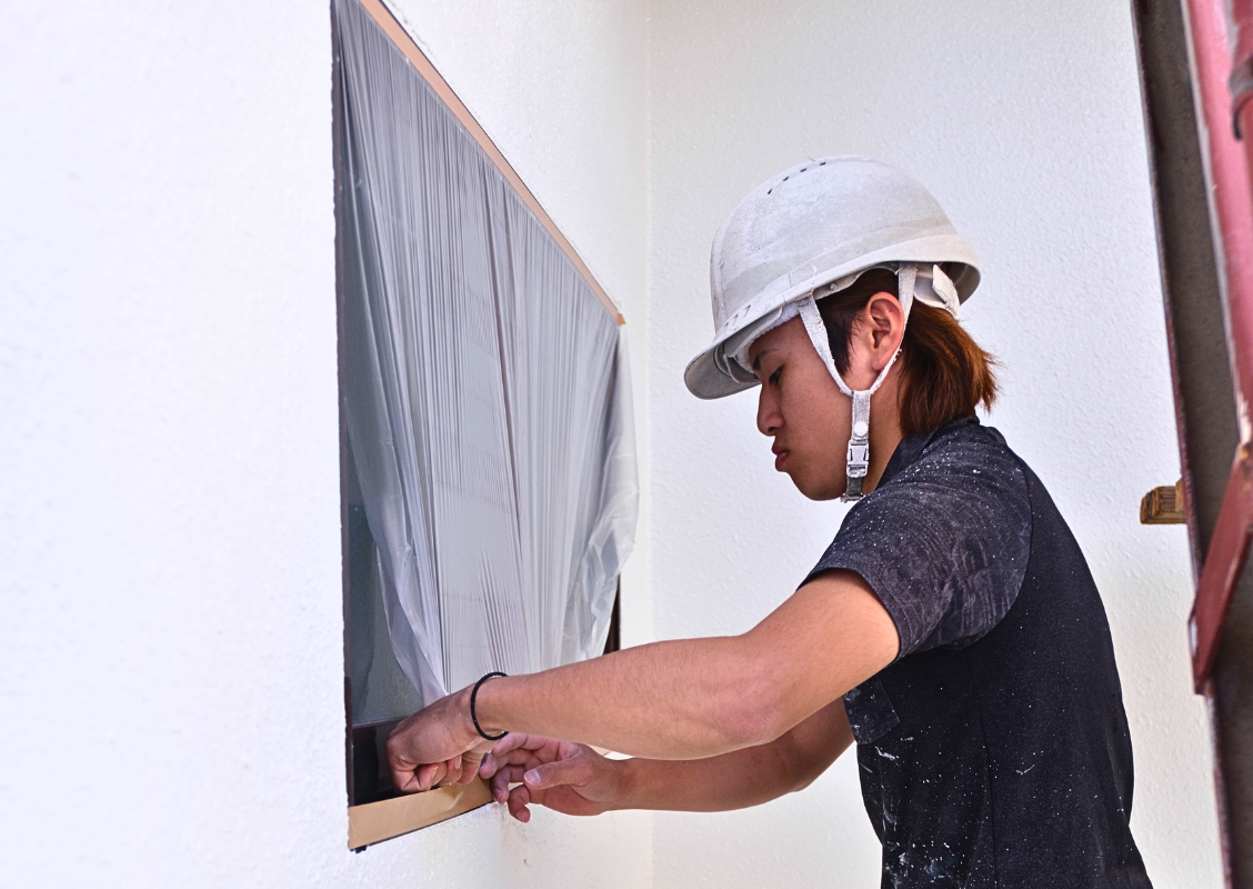 窓や玄関、エアコンの室外機、共用階段、手すりなど、塗装不要な部分を保護する養生作業を行います。入居者様の出入りに配慮し、必要に応じて通行可能なスペースを確保します。