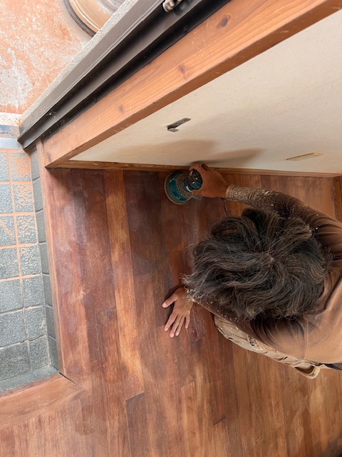 まず、塗装の前にポリッシャーや電動工具などを使って既存のニスを研磨で削っていきます。