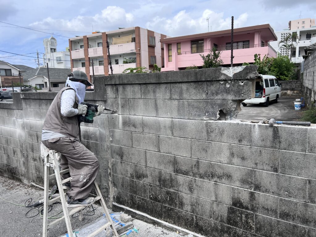 - ブロック上2段ハツリ、撤去(お客様のご要望で通行人の安全確保のため)