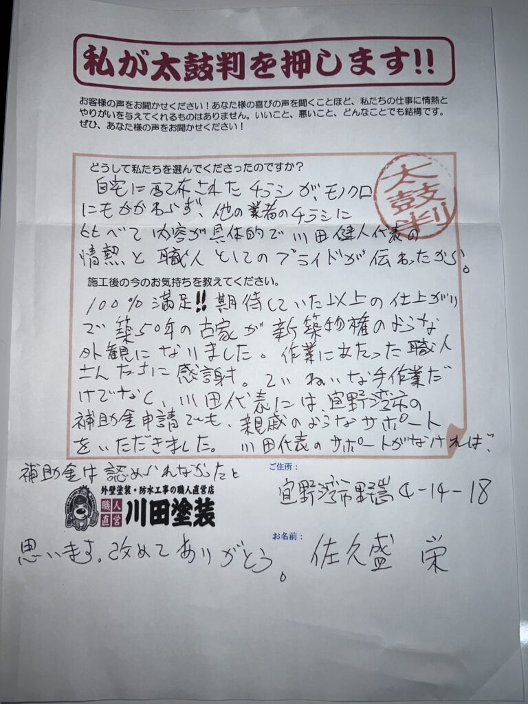 「S さん。今回は、当店ではじめての塗装工事でしたが、ご信頼くださり、誠にありがとうございました。